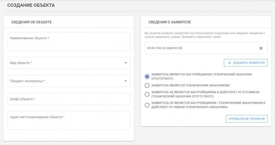 После регистрации в стартовом окне выбрать "Подать документы на негосударственную экспертизу" и заполнить информацию об объекте.