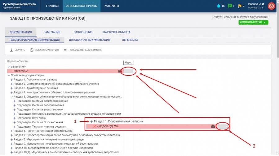 После загрузки документации в правом верхнем углу необходимо нажать "Изменить статус" -> "Передать в экспертизу".