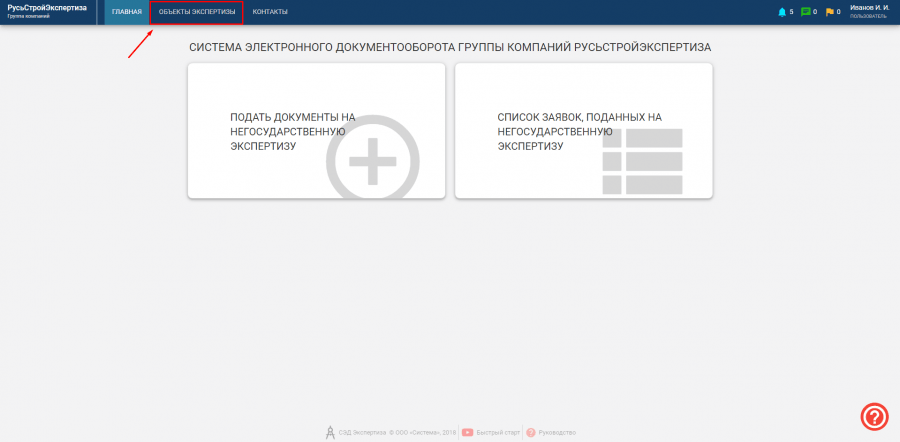 Для начала необходимо перейти в раздел "Объекты экспертизы" в верхнем меню и выбрать там нужный объект.